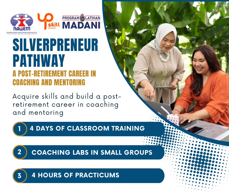 The Silverpreneur Pathway program helps Malaysian retirees succeed in coaching and mentoring by comprehensive training, mentorship, and confidence-building activities to ensure that retirees acquire the essential skills for a rewarding post-retirement career,